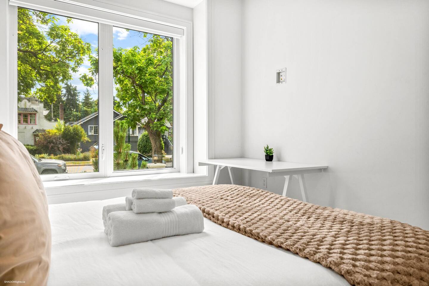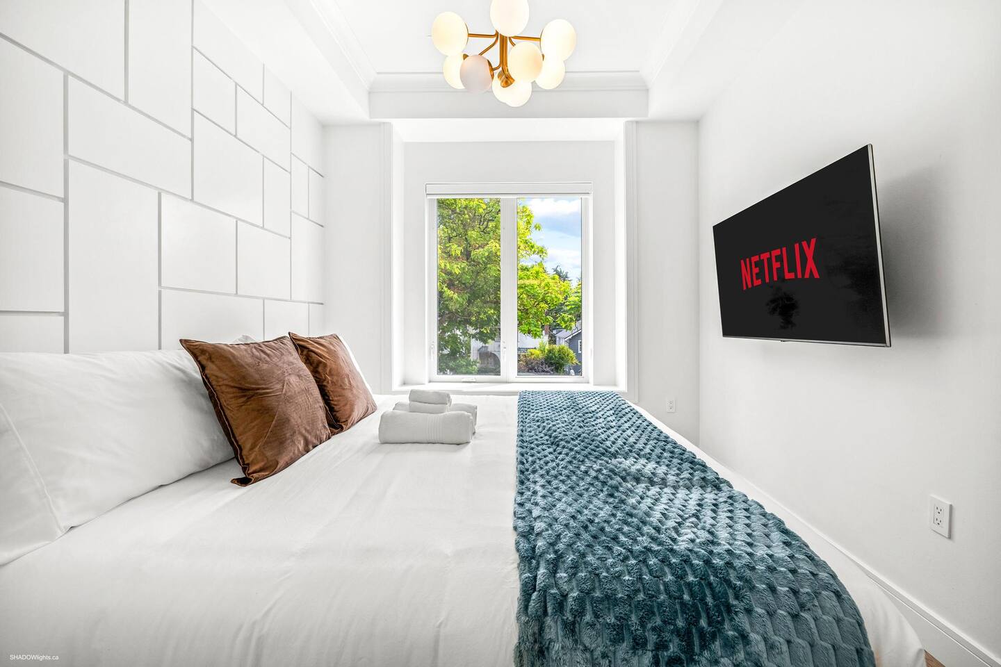 🌊 Minutes from Kits Beach | Rooftop Views | Stylish 3-Bedroom Retreat Modern 3BR Kitsilano home. Master bedroom features a king bed, ensuite, and 55” TV. Two bedrooms have queen beds, one with a walkout patio. Enjoy a fully equipped kitchen, spacious living room with 65” TV, and a private rooftop patio with stunning city and mountain views. Steps to cafés, shops, the seawall, and a short drive to Granville Island and Downtown.